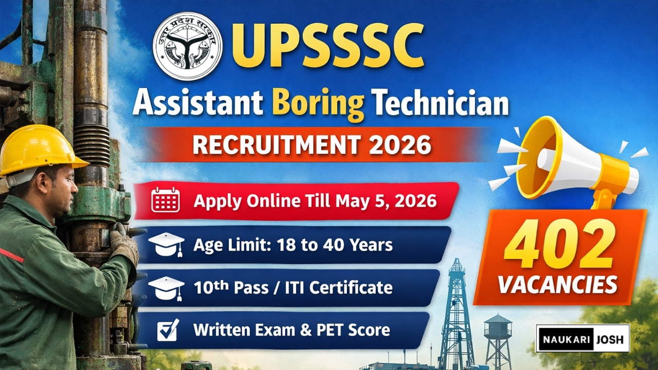 UPSSSC Assistant Boring Technician Recruitment 2026 : The Uttar Pradesh Subordinate Service Selection Commission has started the online registration process for the Assistant Boring Technician Recruitment 2026. Interested and eligible candidates can apply for a total of 402 vacancies through the official website, upsssc.gov.in. The last date to submit the application form is May 5, 2026.